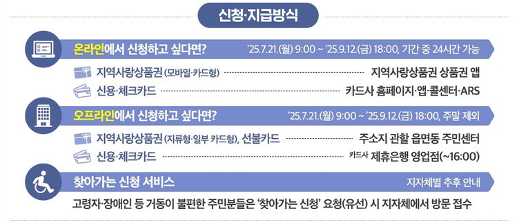 - 온라인: 지역사랑상품권 상품권 앱 또는 카드사 홈페이지, 앱, 콜센터, ARS 신청