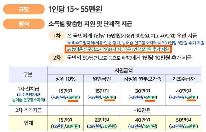 | 1차 지급 (전 국민) | 15만 원 (기초생활수급자/차상위 30만 원) |