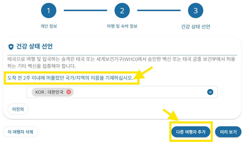 → 입국 전 2주 내 체류 국가(다른 나라 방문 이력이 없다면 그냥 넘어가도 됨)