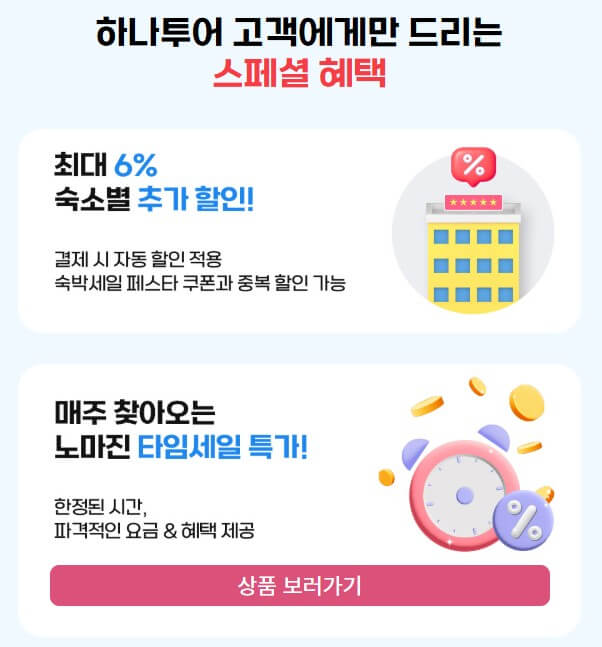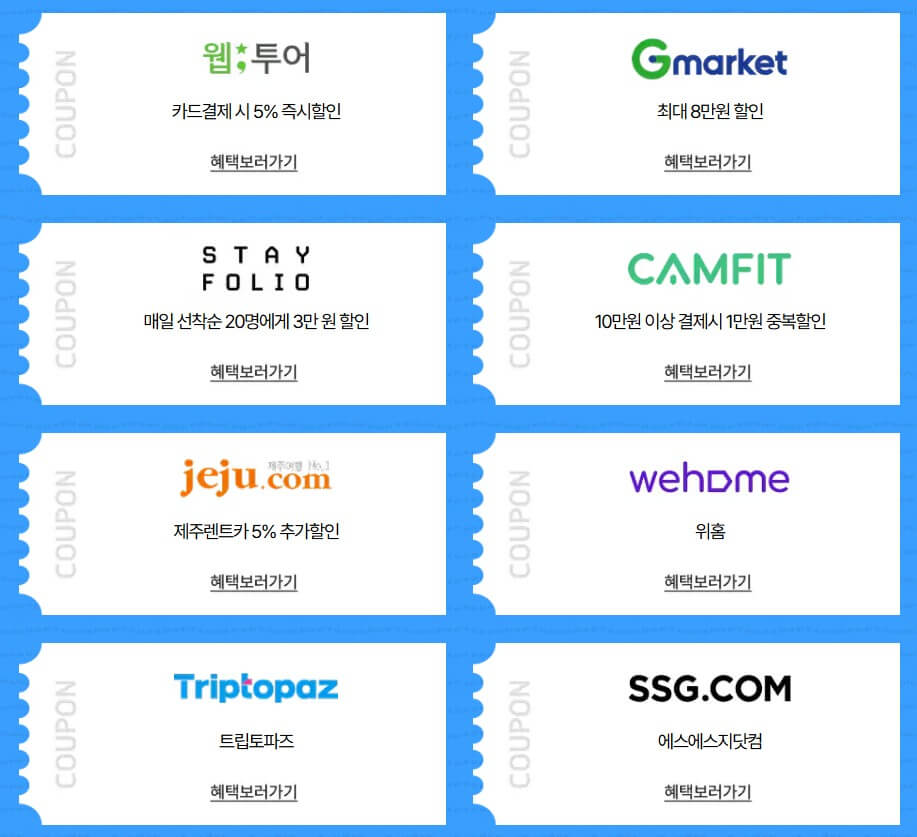- 웹투어: 행사 숙소 8% 할인 + 카드 추가 5% + 여행 완료 시 10% 재할인 쿠폰 제공