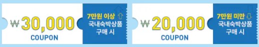 - 7만원 미만 국내숙박상품 구매 시 2만원 할인 (단, 부가세 포함 2만원 이상 숙박상품 예약 시)